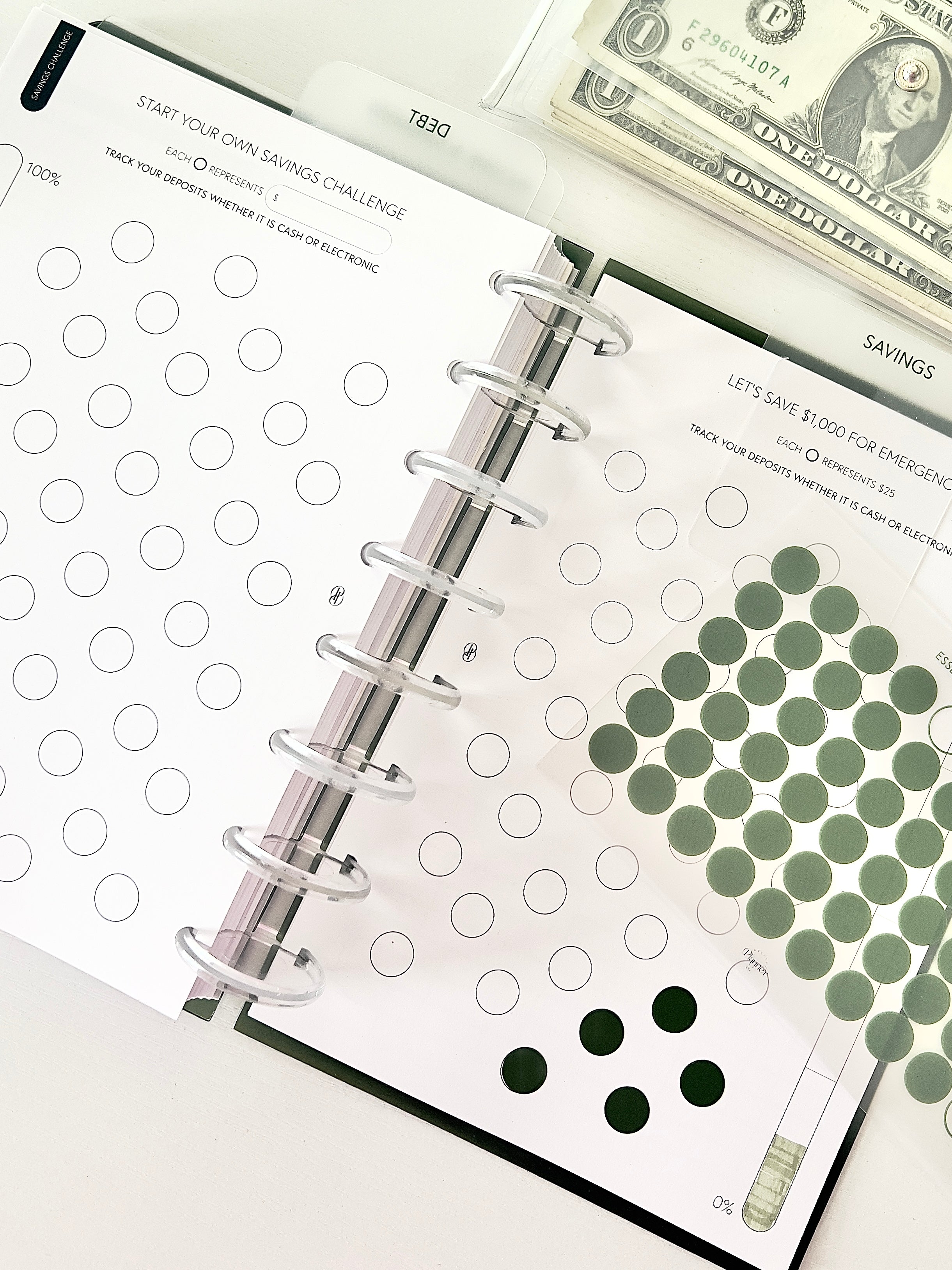 - Savings- The Savings Challenges sheets offer a guided path to saving $1,000 for emergencies, along with an additional option for a seperate, customizable savings challenge.